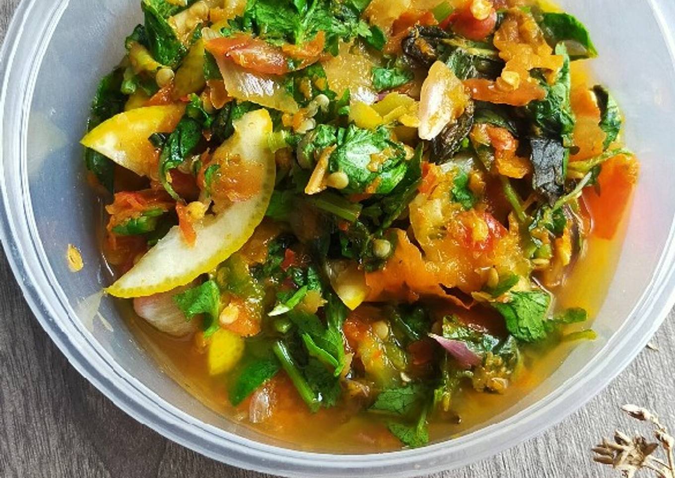 - Siapkan semua bahan, cuci bersih, iris iris semua daun,iris jeruk lemon dan peras airnya. Uleg cabai, dan bawang merah. Campur semua bahan