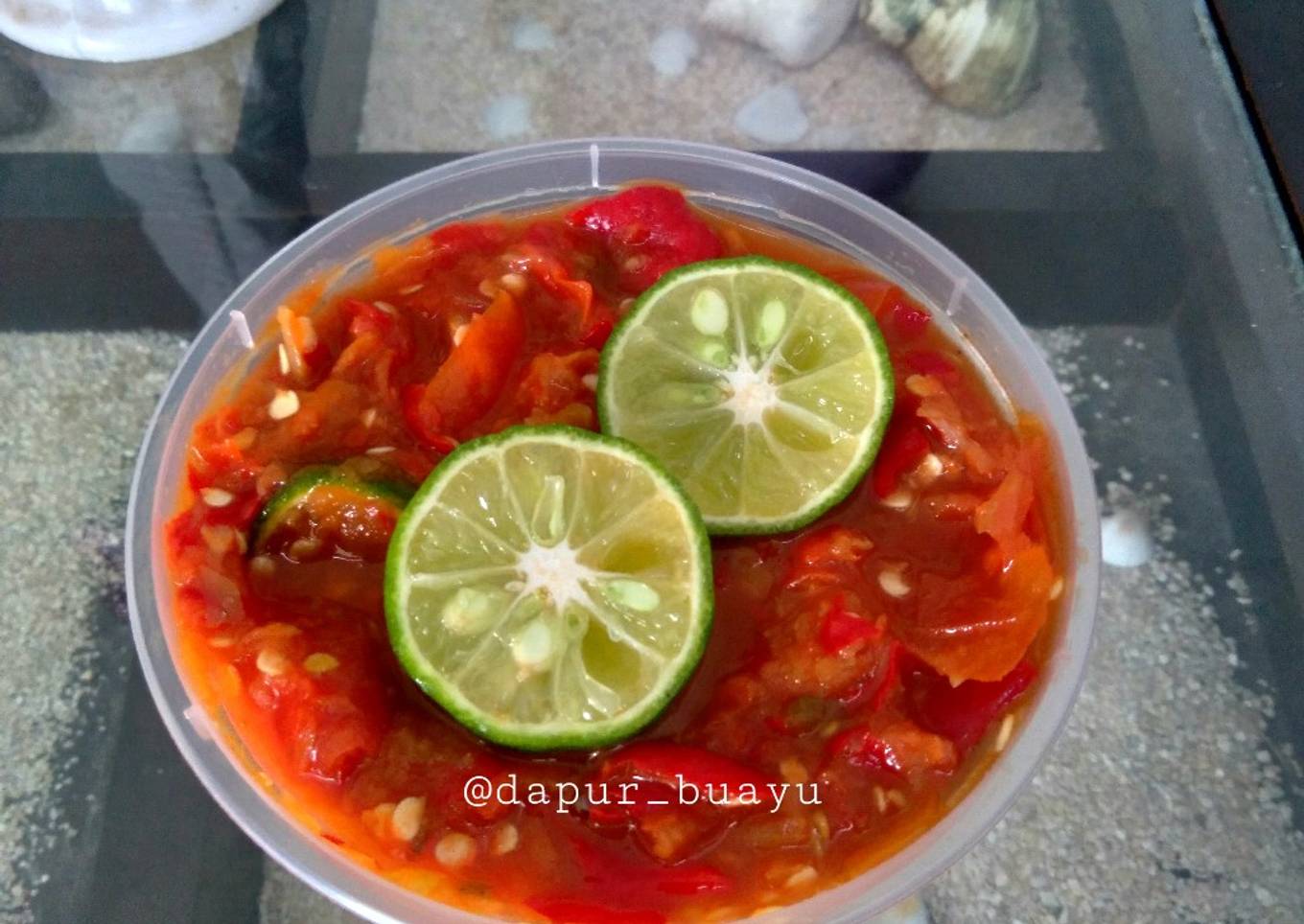 - Siapkan cobek, masukkan duo cabe gula garam dan terasi ulek kasar atau sesuai selera. Tambahkan tomat lalu ulek kembali. Terakhir tambahkan perasan jeruk limau..bagi yg suka bs ditambah kaldu bubuk atau penyedap ya...