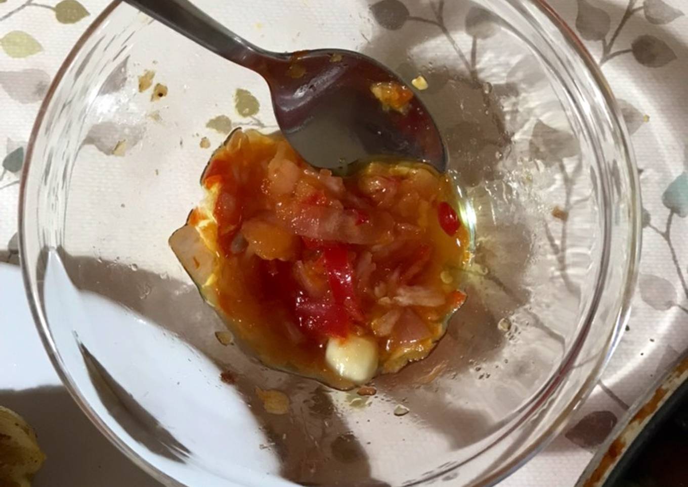 - Tambahkan satu sendok (atau bisa lebih, tergantung sebanyak apa sambalnya) minyak jelantah ke sambal yang sudah jadi, aduk rata. Sajikan.