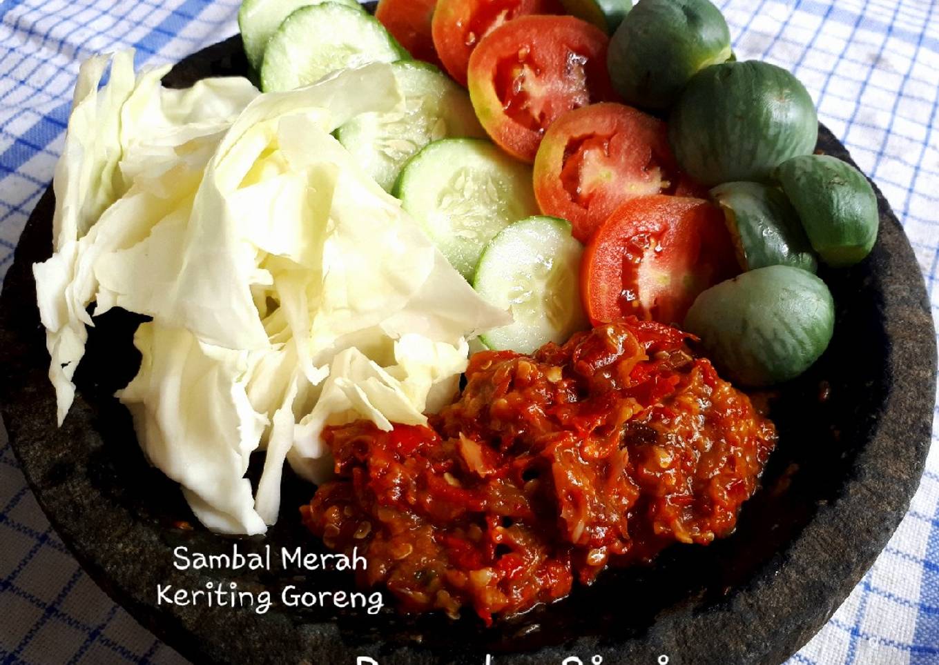 - Sambal merah keriting goreng siap disajikan bersama lalapan dan nasi hangat yang banyak.