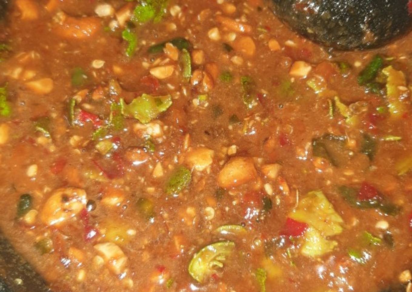 - Ulek cabe, terasi di bakar dulu, garem, tambahin gula jawa, lalu asem mentah ulek sampe kecampur rata lalu terakhir kacang mede goreng.