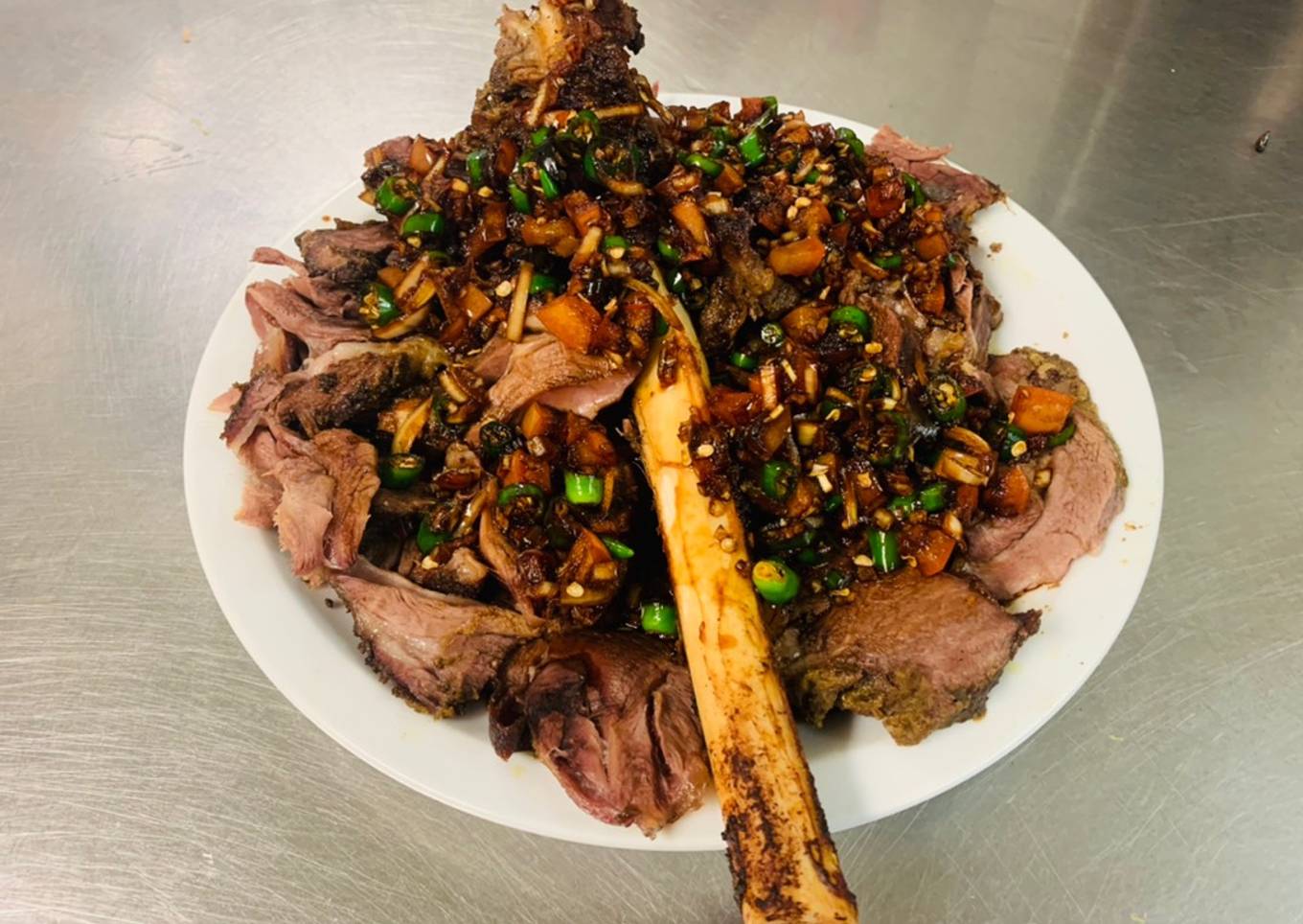 - Kemudian masukan 10 sendok makan kecap manis, aduk hingga merata. Kemudian keluarkan paha kambing dari dalam oven dan taruh di atas telenan.