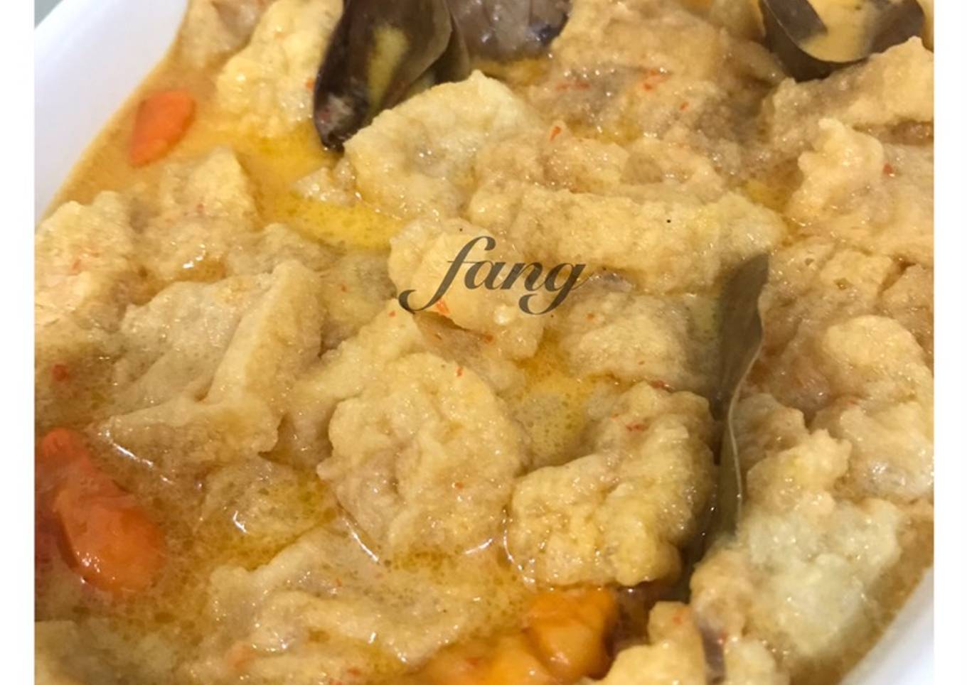 - Tumis bumbu halus, daun salam, laos, sampe matang dan harum. Tuang santan dan air, aduk2 sampe mendidih. Masukkan gula merah, garam,kaldu bubuk. Tes rasa, kalo sudah pas masukkan krupuk kulitnya. Masak sampe layu, angkat.